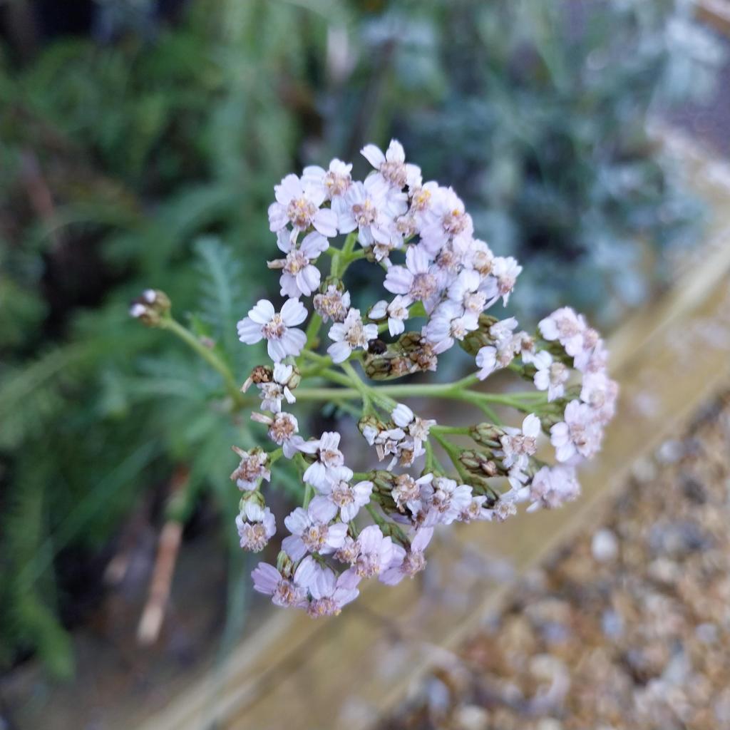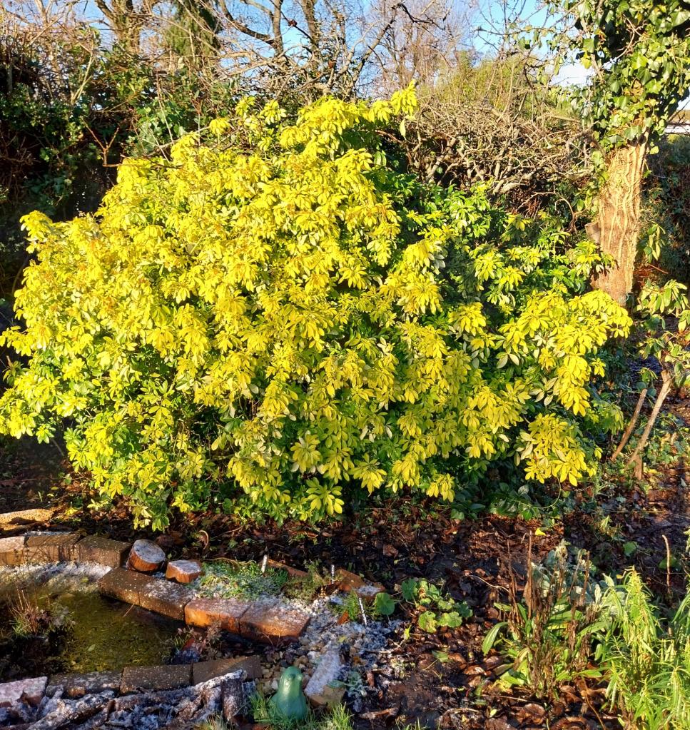 (L to R) One – The pyracantha growing over our garden gate is still covered in berries. Two – Just about the last remaining, rather tatty flower of achillea millefolium ‘Cerise Queen’. The achillea took over in the borders last year, smothering other plants. I divided some of the larger clumps back in the autumn and potted them up ready to be moved to new raised beds in the front garden. (Perhaps more on that next time.) Three – Choiysa ternata ‘Sundance’ living up to its name. If you look closely you’ll see the only frog to visit our new wildlife pond so far is a terracotta one.