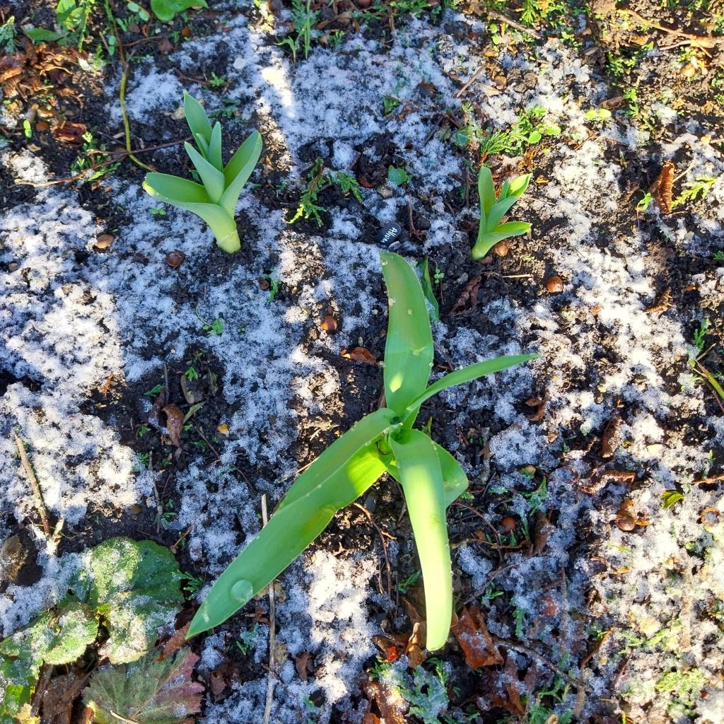 (L to R) Four – I like the foliage combination of aucuba japonica and arbutus unedo, the latter with most of its strawberry-like fruits now on the ground. At least, those the pigeons haven’t snaffled. Five – It seems way too early to see the leaves of allium schubertii appearing but here they are poking up through frosty earth. There’s nothing around them because I’ve been clearing the bed they’re in as part of another project. (Like most gardeners, I have many projects on the go.) Six – My first attempt at growing purple sprouting broccoli. Whether it will get big enough to be worth harvesting is another matter.