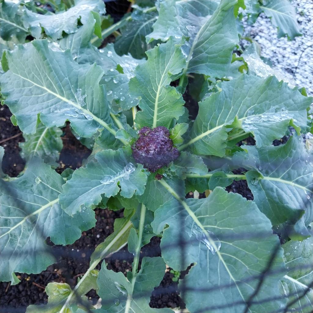 Welcome Cathy and you have started off with a fine six. Your purple sprouting broccoli is looking good and has a little way to go before being ready to be picked. The heads are not as large as for the green broccoli you see in the shops, but it is very hardy, and once the leading shoot is picked several side shoots should follow.