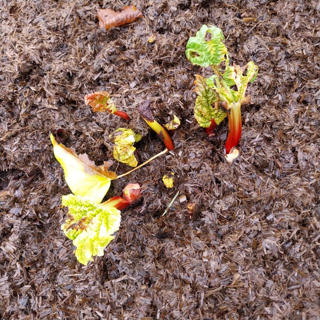 Three – And here’s another one. Rhubarb ‘Timperley Early’ emerging from the soil, even if the leaves are looking a bit tatty. This will be its second year so, fingers crossed, we’ll be able to harvest some for the first time.